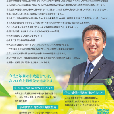 「これから先も福津に暮らしたい」と、 子どもからお年寄りまで、 住民が思い続けられるように。子どもの未来に寄り添う。 私には夢があります。 福津のリーダーとして、福津に暮らす私たち、 これから福津を担う子どもたちと住み続けたくなるまちにしていくことです。 誰もが生き生きと活躍し、福津に暮らす人たち同士が未来を描き、 一緒に活動していくまちを目指します。