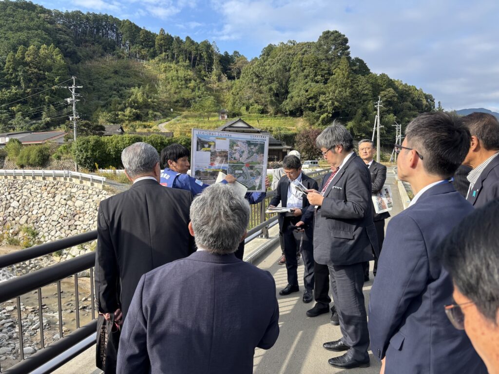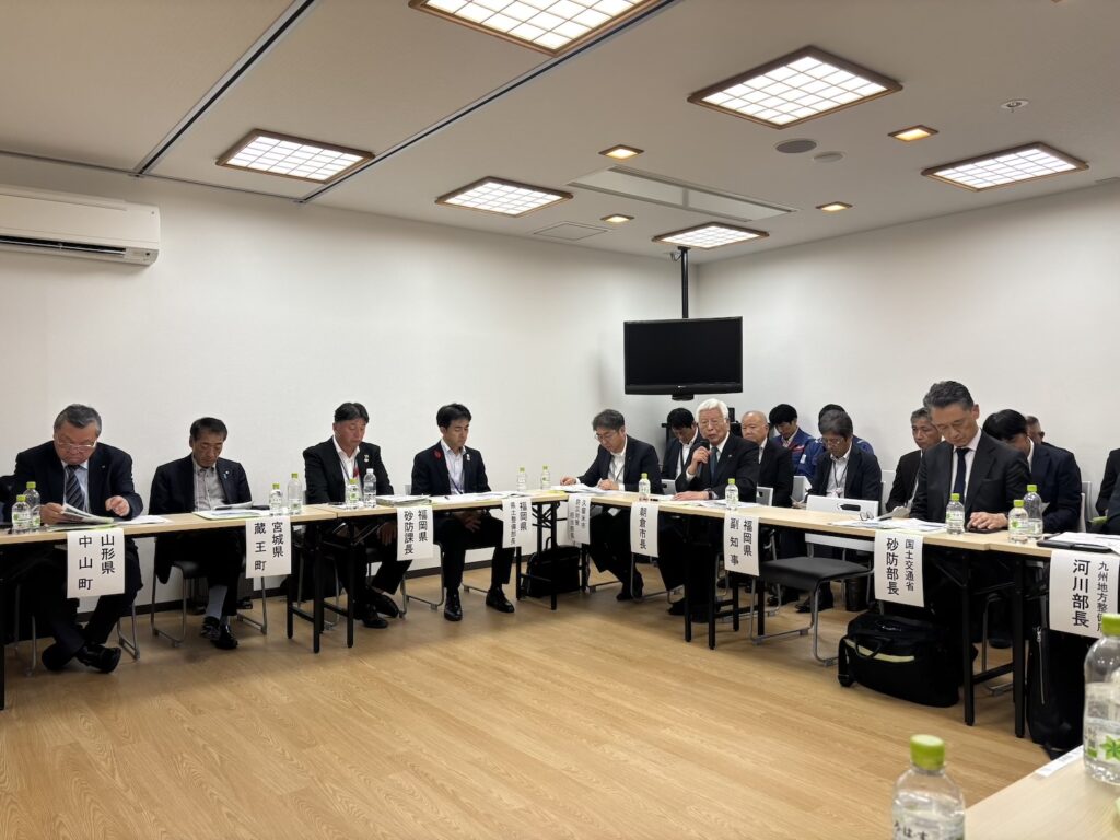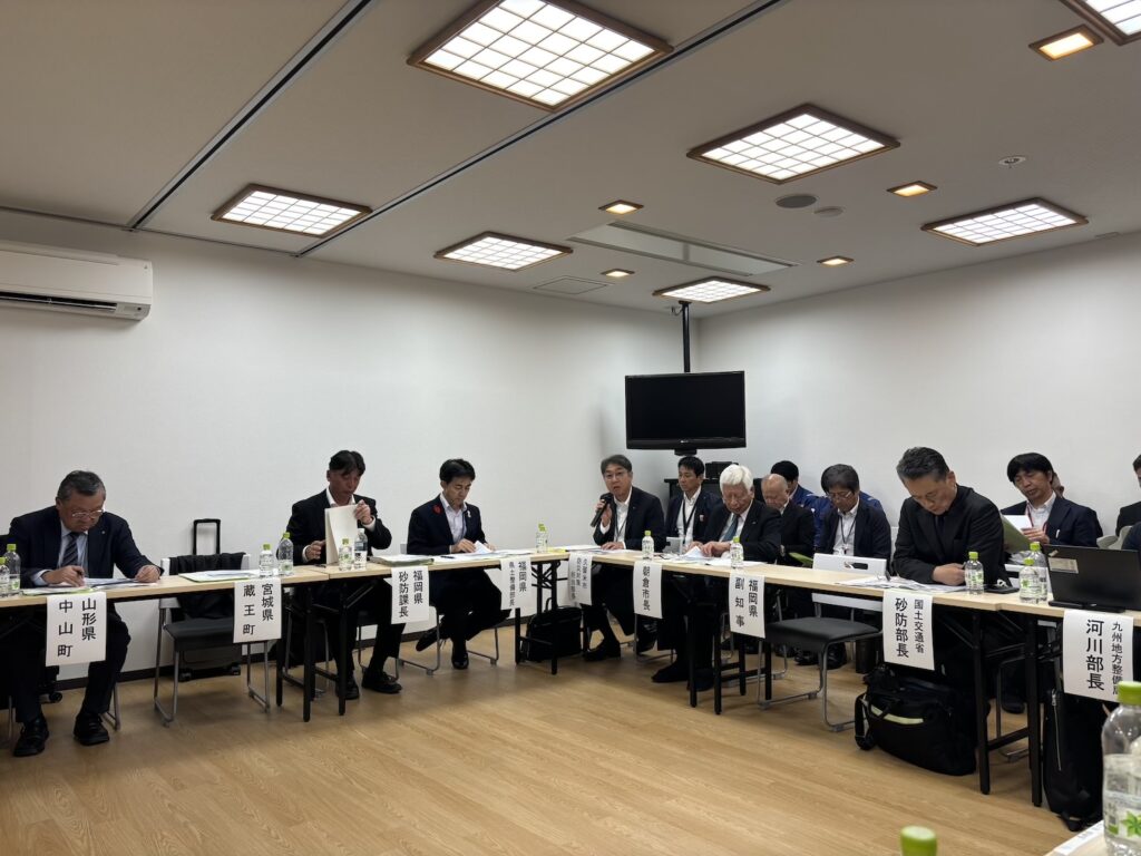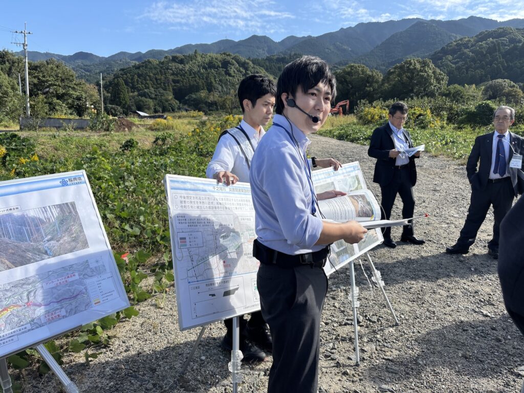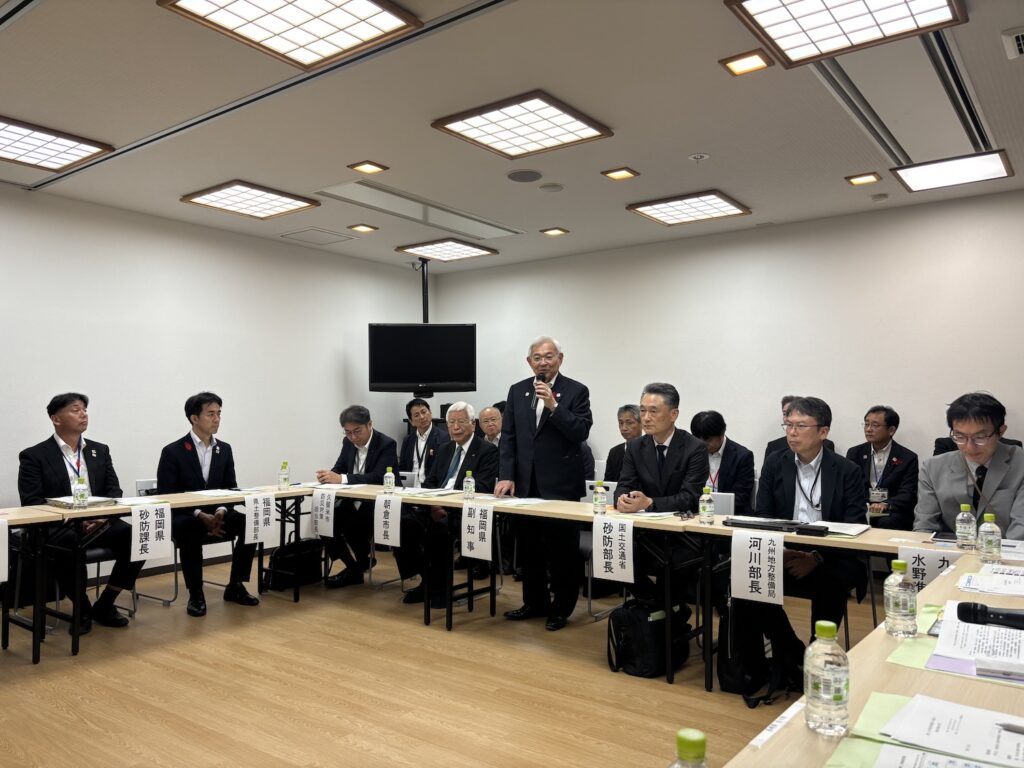 久留米市の土石流災害復旧現場と、朝倉市の砂防施設を視察し、その後は九州大学の水野準教授をはじめ、国土交通省、福岡県、久留米市、朝倉市の関係者の皆さまと事例発表などを基に討論を行いました。