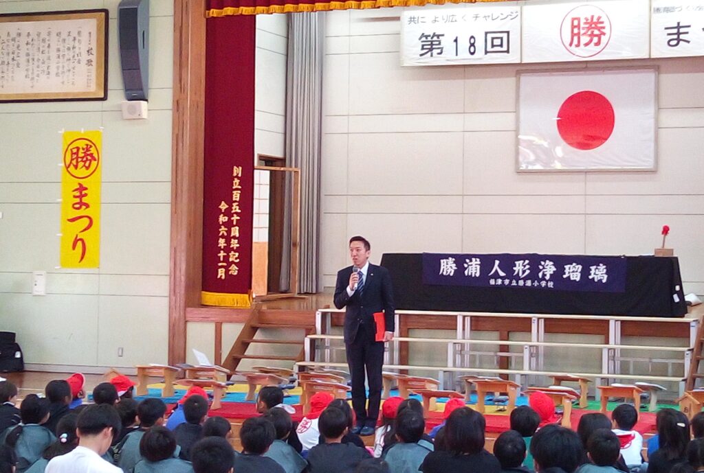 福津市の勝浦小学校の「マル勝まつり」と神興小学校の「ハッピーフェスタ」に来賓として出席