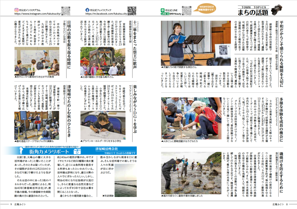 まちの話題(津屋崎小学校の平和学習、大峰山でのサバイバルキャンプ など)