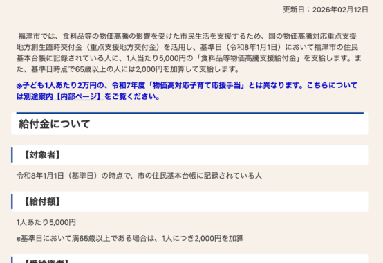 国の経済対策(11月閣議決定・12月補正予算可決)を受け、福津市でも物価高への対応の検討を進めています。